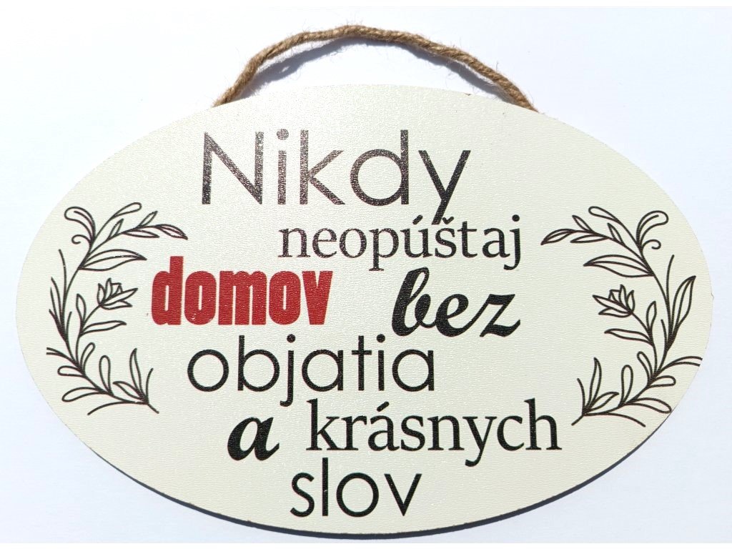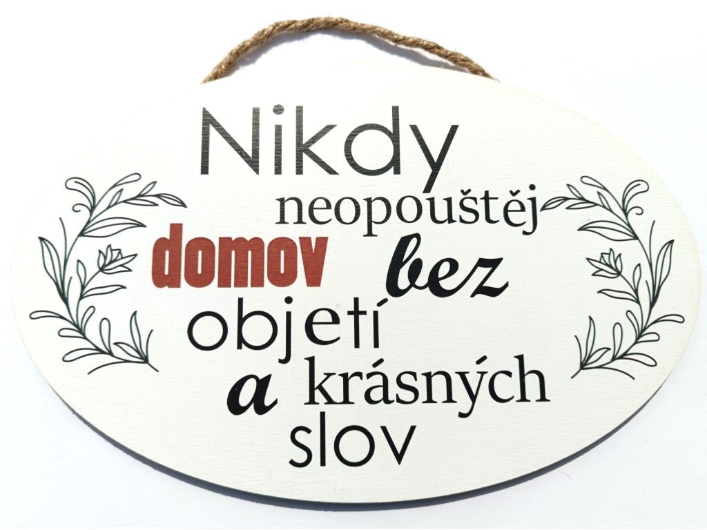 Dřevěná dekorace s citátem "Nikdy neopouštěj domov bez objetí a krásných slov" k zavěšení. S českým i slovenským textem.