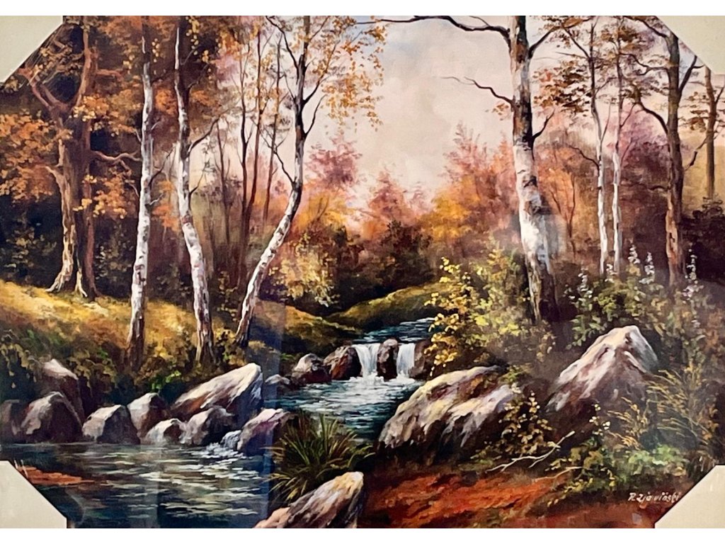 Obraz potoku v březovém háji je vhodnou dekorací do každého bytu..