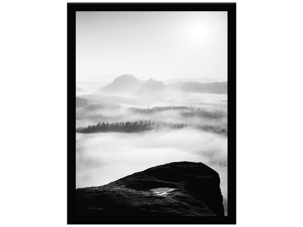 Moderní černobílý obraz, který zobrazuje horské vrcholy v mlze. Hodí se třeba do obýváku.
