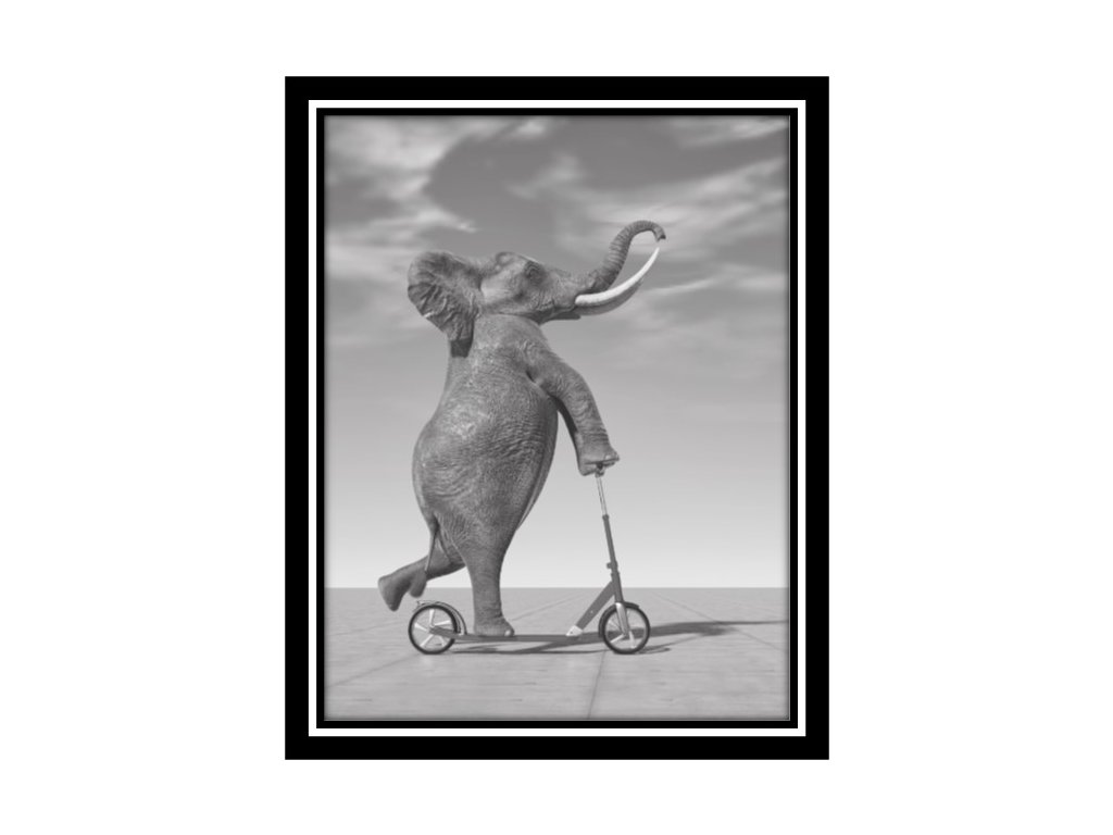 Moderní černobílý obraz, který zobrazuje slona na koloběžce. Hodí se třeba do dětského pokoje.