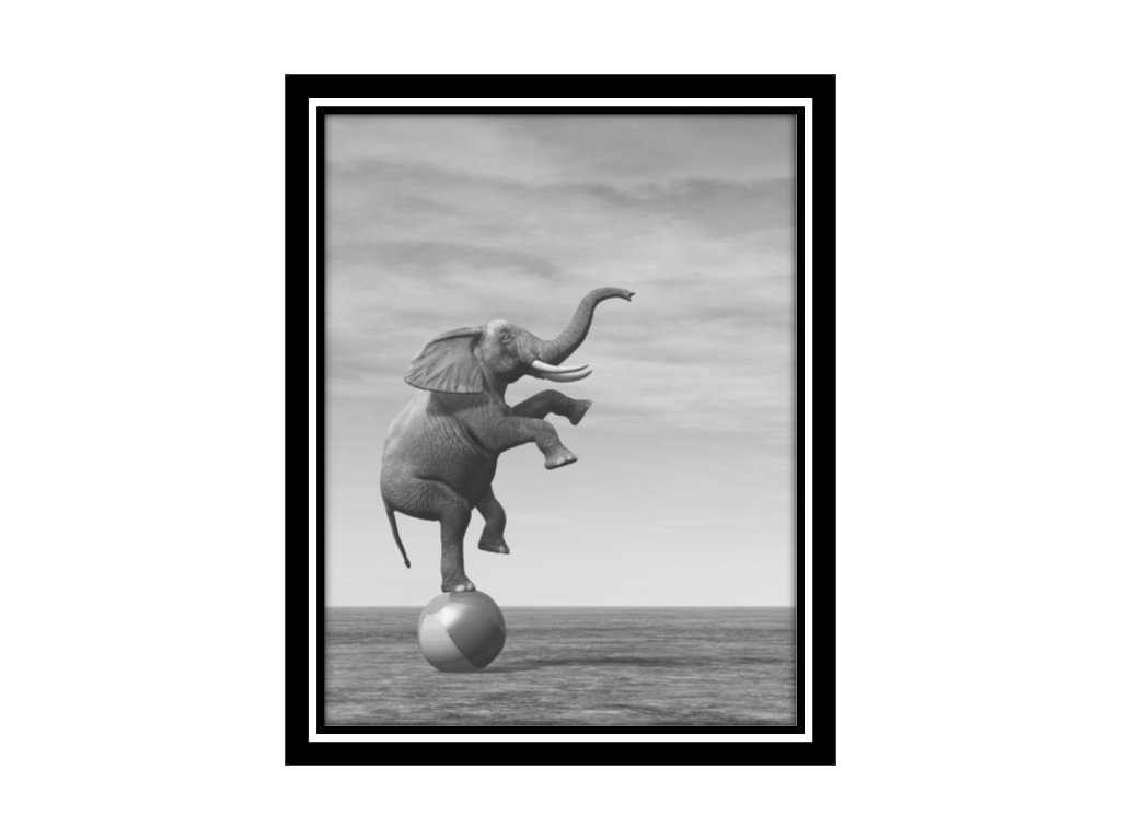 Moderní černobílý obraz, který zobrazuje slona na míči. Hodí se třeba do dětského pokoje.