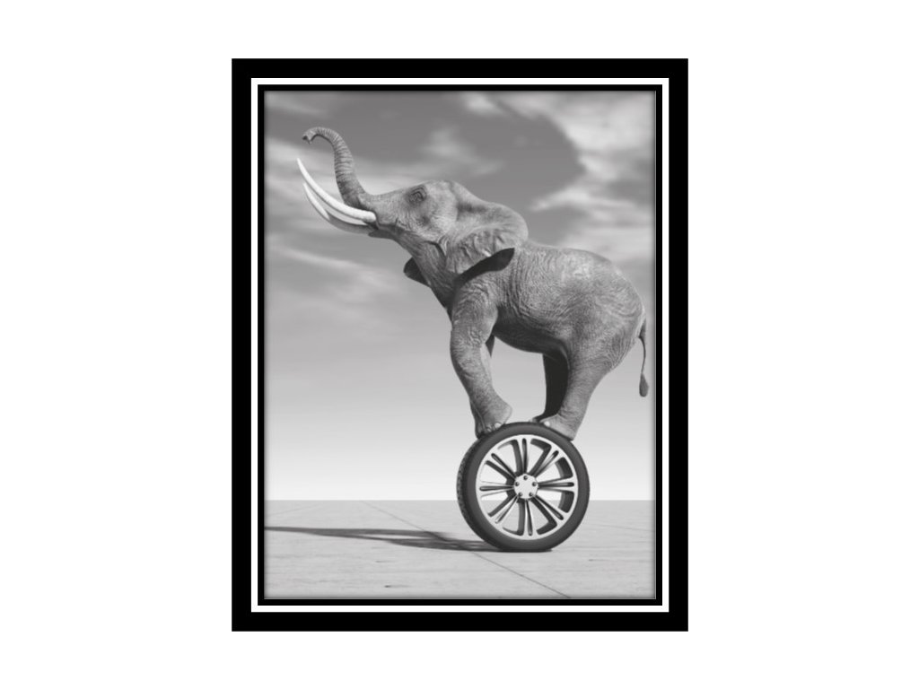 Moderní černobílý obraz, který zobrazuje slona na pneu. Hodí se třeba do dětského pokoje.