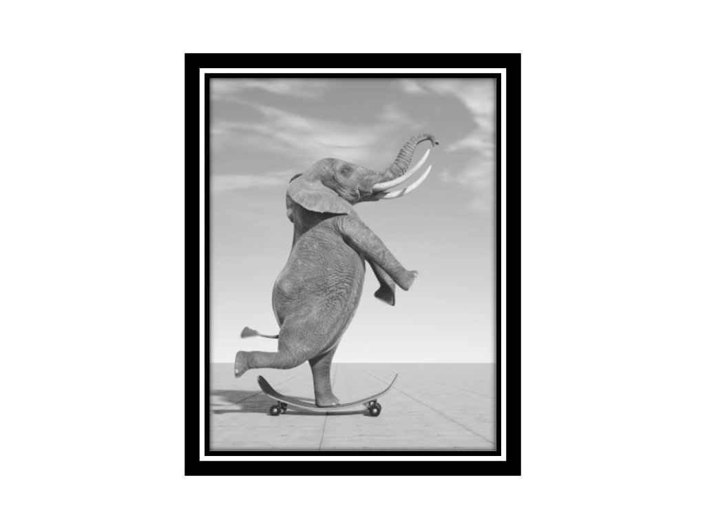 Moderní černobílý obraz, který zobrazuje slona na skateboardu. Hodí se třeba do dětského pokoje.