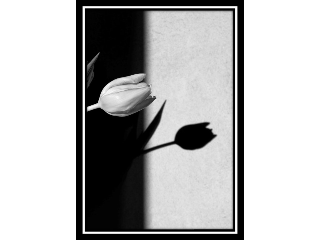 Moderní černobílý obraz, který zobrazuje tulipán. Hodí se třeba do obýváku, kuchyně nebo kavárny.
