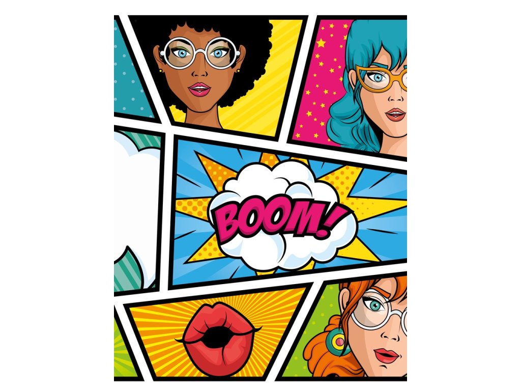 Obraz ve stylu komiksu je tvořen ve stylu pop-artového komiksu, typického pro 60. léta. Zachycuje tři ženské tváře z různých pohledů. Tento obraz je ideální do moderních interiérů, např. do bytu, ateliéru nebo kanceláře, také do kadeřnictví, kosmetických salónů, módních butiků. Může být také vhodným dárkem k narozeninám.