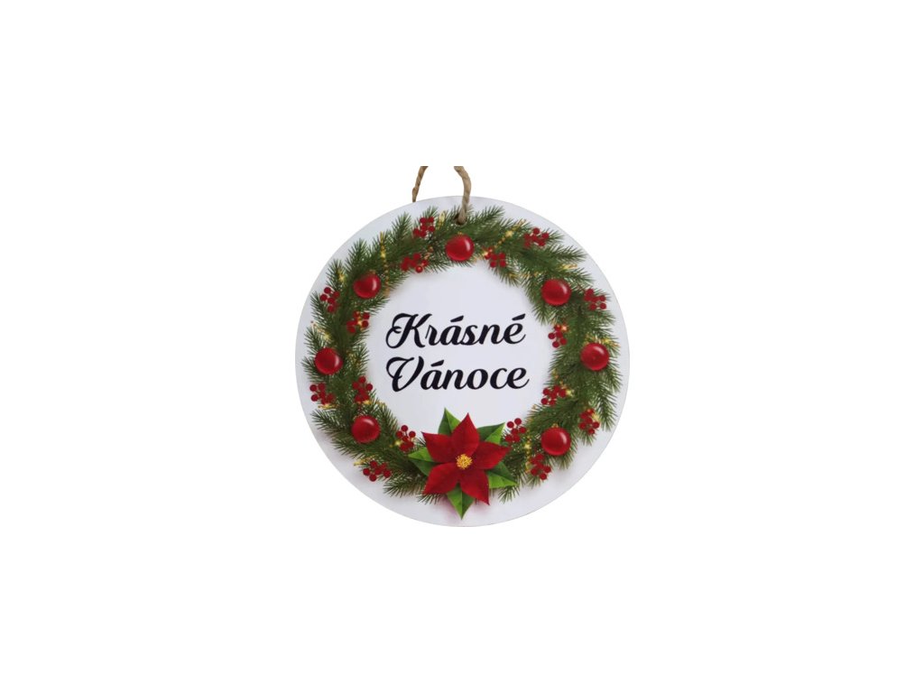 Vánoční dřevěná dekorace kulatá "Krásné Vánoce",  k zavěšení.  V českém i slovenském textu.