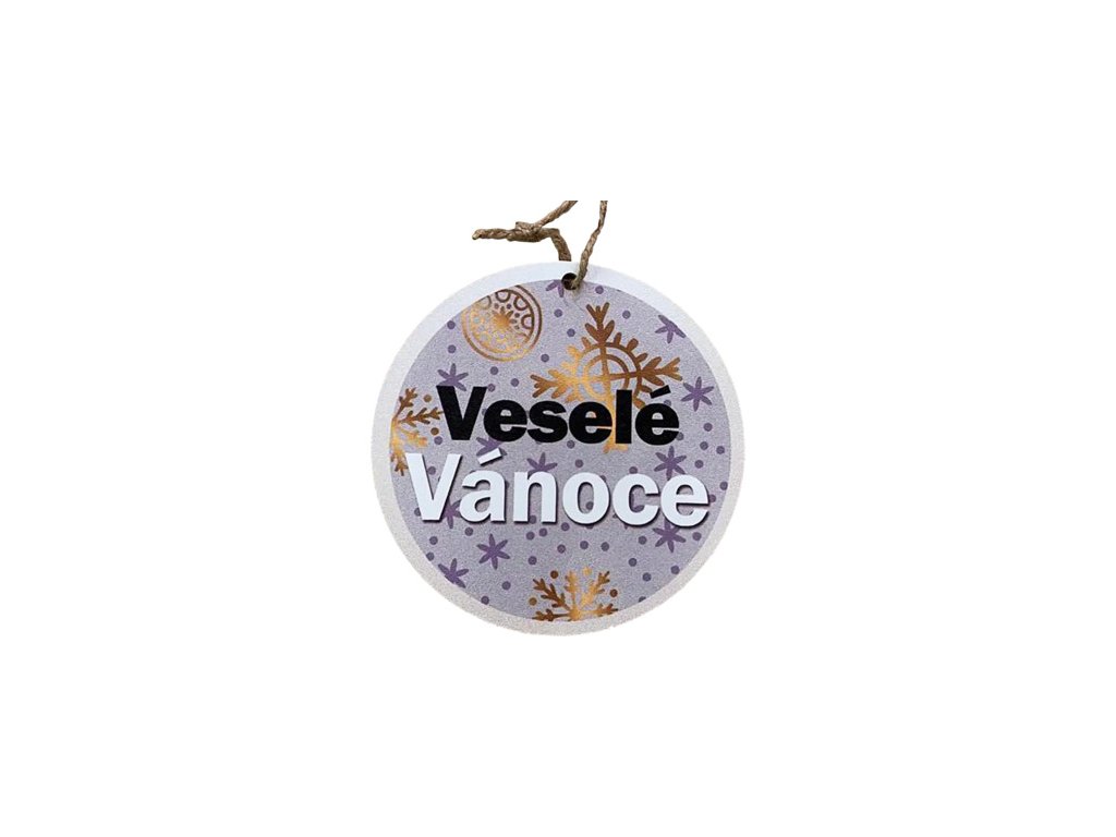 Vánoční dřevěná dekorace kulatá "Veselé vánoce", k zavěšení. V českém i slovenském textu.